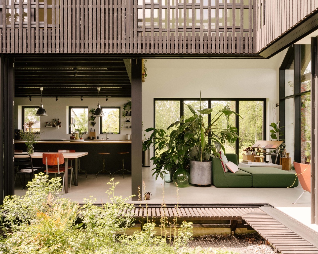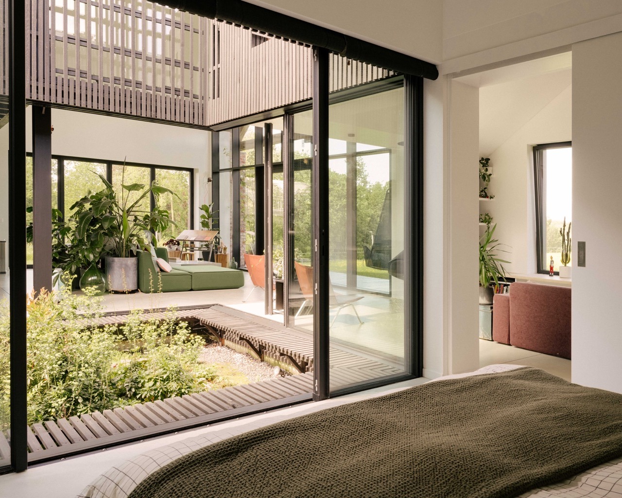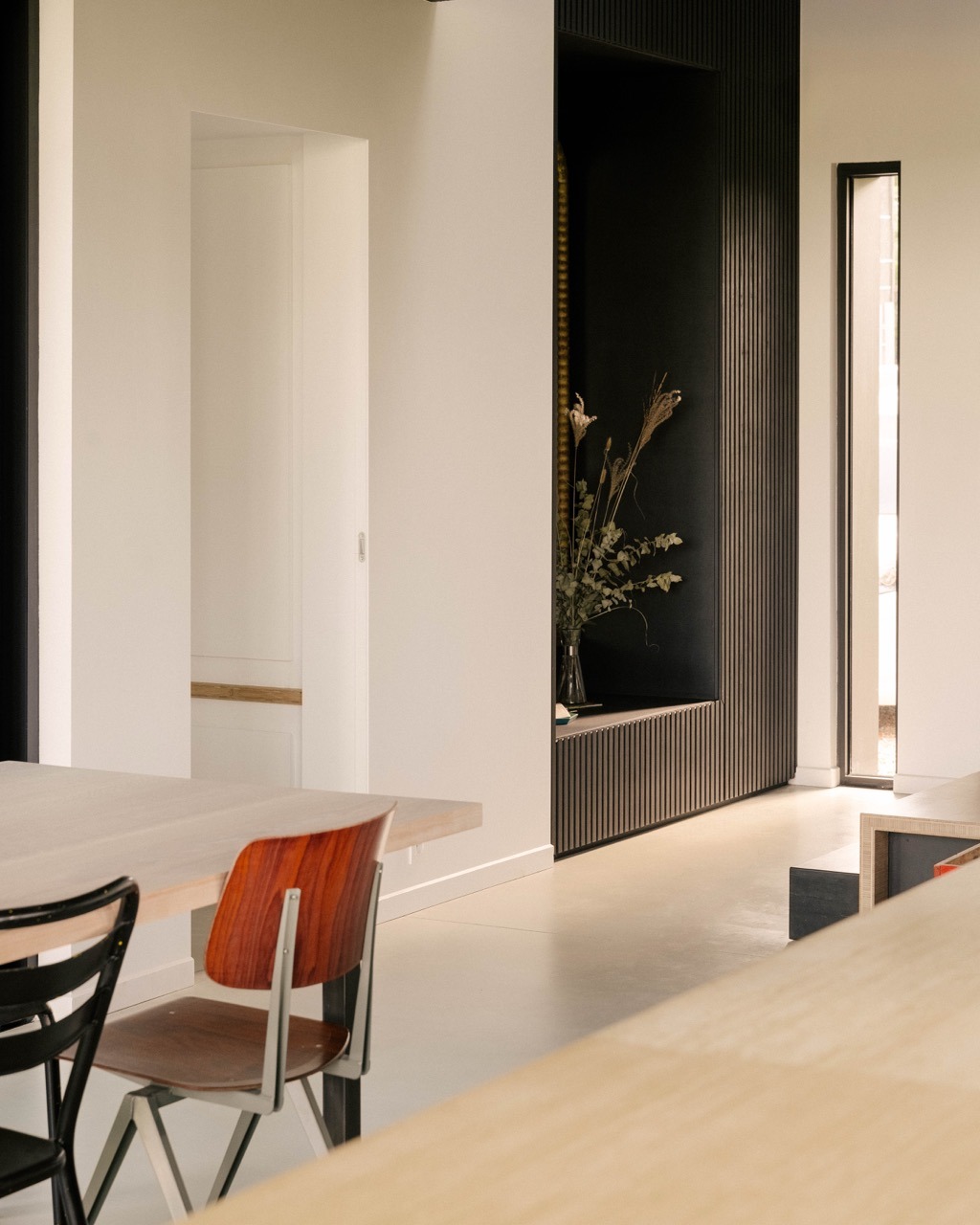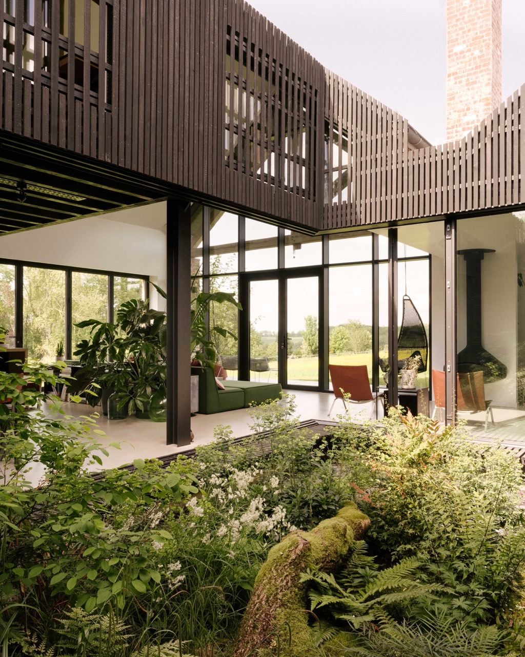En lisière de village, l’Atelier d’Architecture d’Hoop Bergé conçoit une maison unifamiliale structurée autour d’un patio central, organisant le plan ouvert et apportant lumière et respiration aux espaces. Deux volumes parallèles, asymétriques et légèrement décalés, s’inscrivent avec justesse dans le relief naturel et le cadre rural environnant. L’architecture joue sur un équilibre entre retenue et ouverture : des façades sobres préservent l’intimité côté village, tandis que de larges ouvertures cadrent la campagne au nord, dans un dialogue subtil entre tradition et contemporanéité. La structure en ossature bois, ponctuée de fermes en chêne et d’éléments en acier, affirme une matérialité honnête et durable, issue de filières locales.